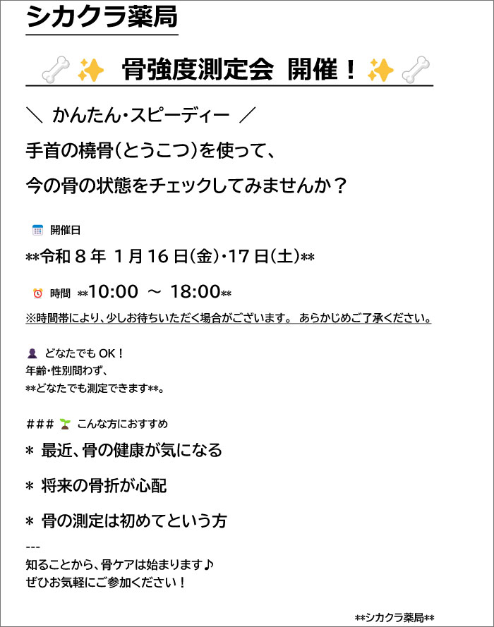 開 催 日:2026年1月16日(金)~17日(土) 10:00~18:00 開催場所:シカクラ薬局内待合室(南小岩7-11-2) 定 員:なし 開催内容: 手首の骨、トウ骨を使って簡単に測定します。 強度によって生活習慣に絡めて指導をおこないます。 ご気軽にお立ち寄りください。 お申込み:03-3658-4193